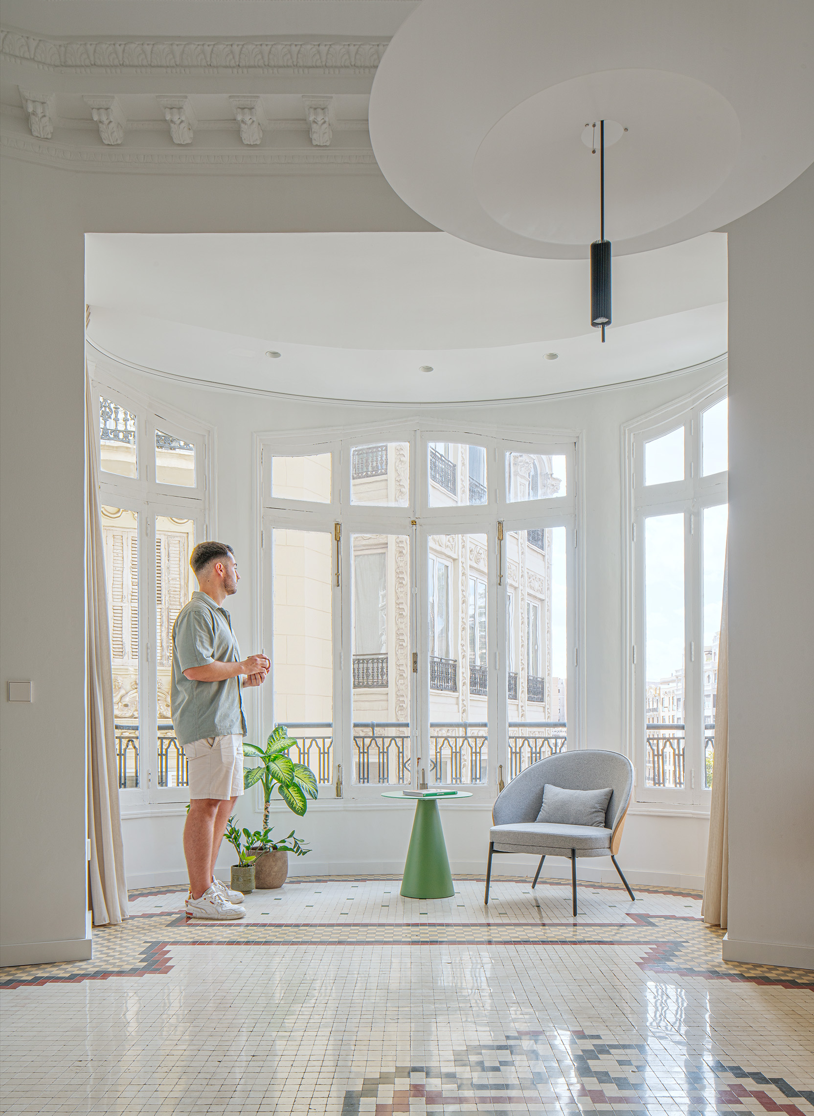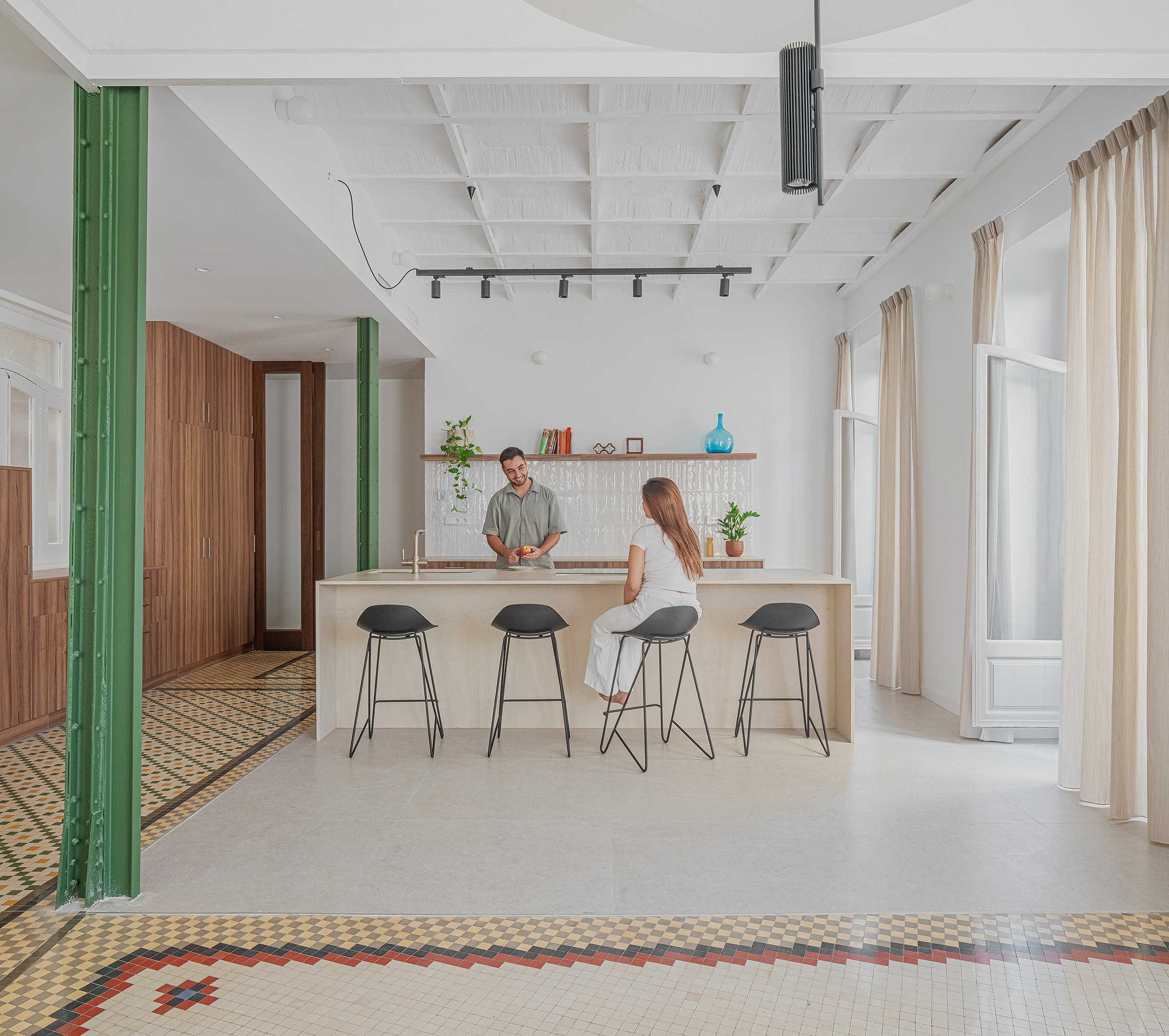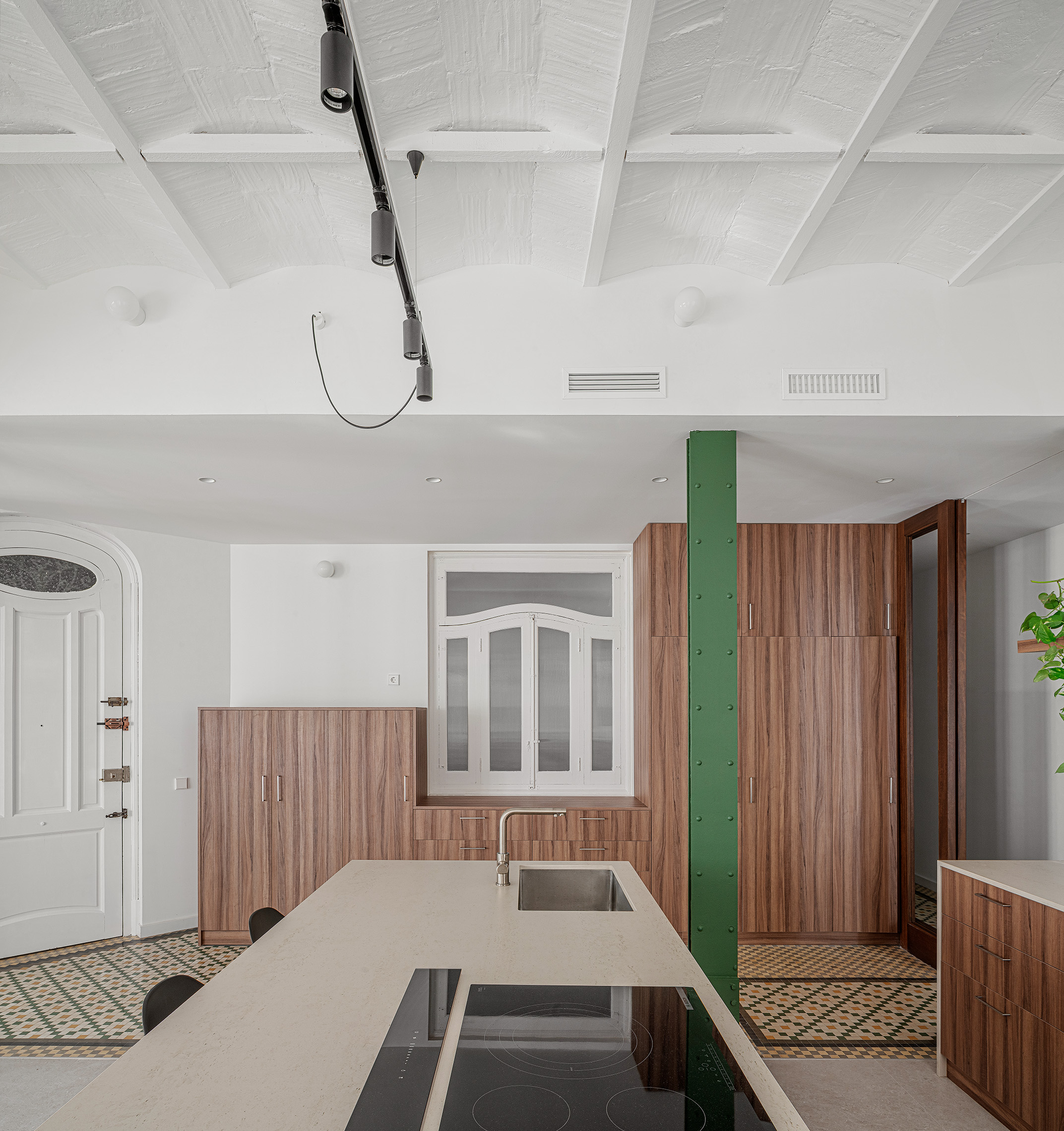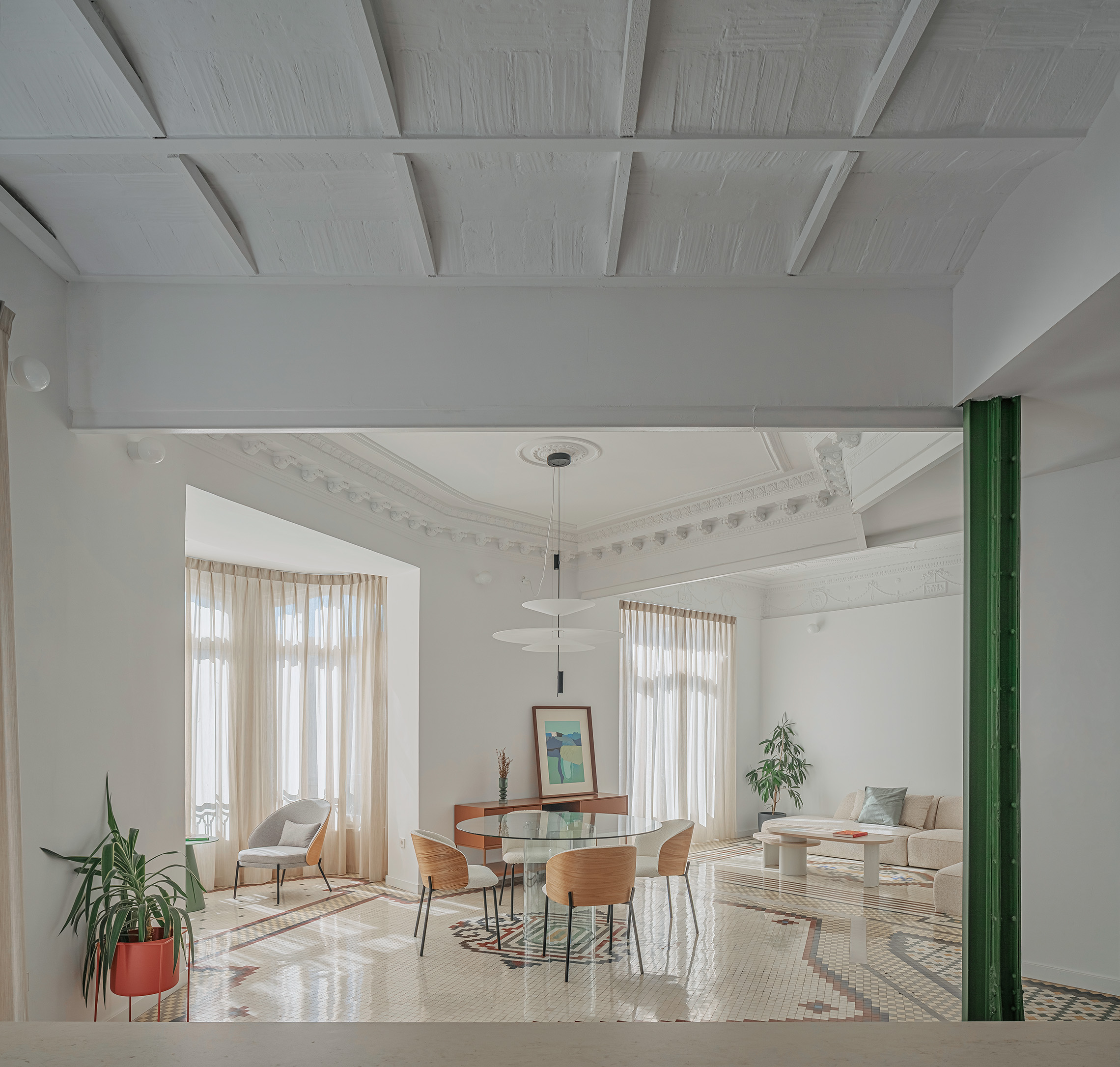 El nuevo esquema espacial responde a la necesidad de integrar las áreas sociales de la vivienda. La eliminación de tabiques permitió abrir la cocina al salón-comedor, generando un único ámbito continuo que aprovecha al máximo la luz natural procedente de la fachada principal. El mirador curvo, pieza singular del edificio, se incorpora al espacio central como elemento protagonista, reforzando la relación visual con el exterior. La intervención revela y pone en valor la estructura original, integrando los pilares metálicos y el forjado descubierto como parte del lenguaje arquitectónico del proyecto.