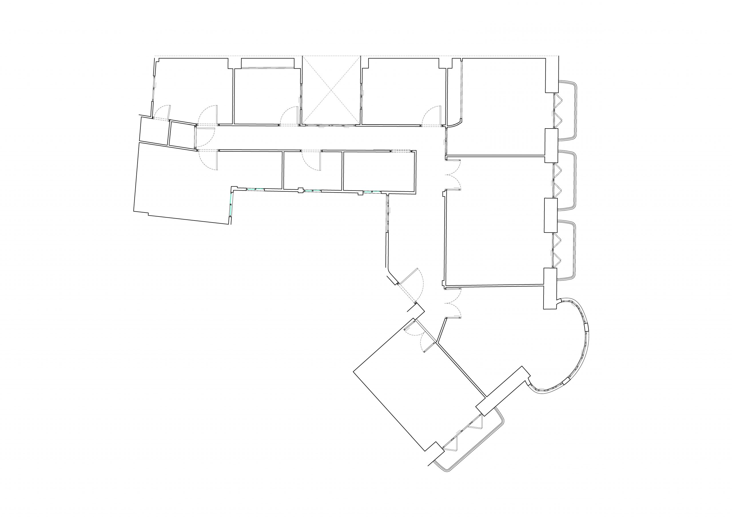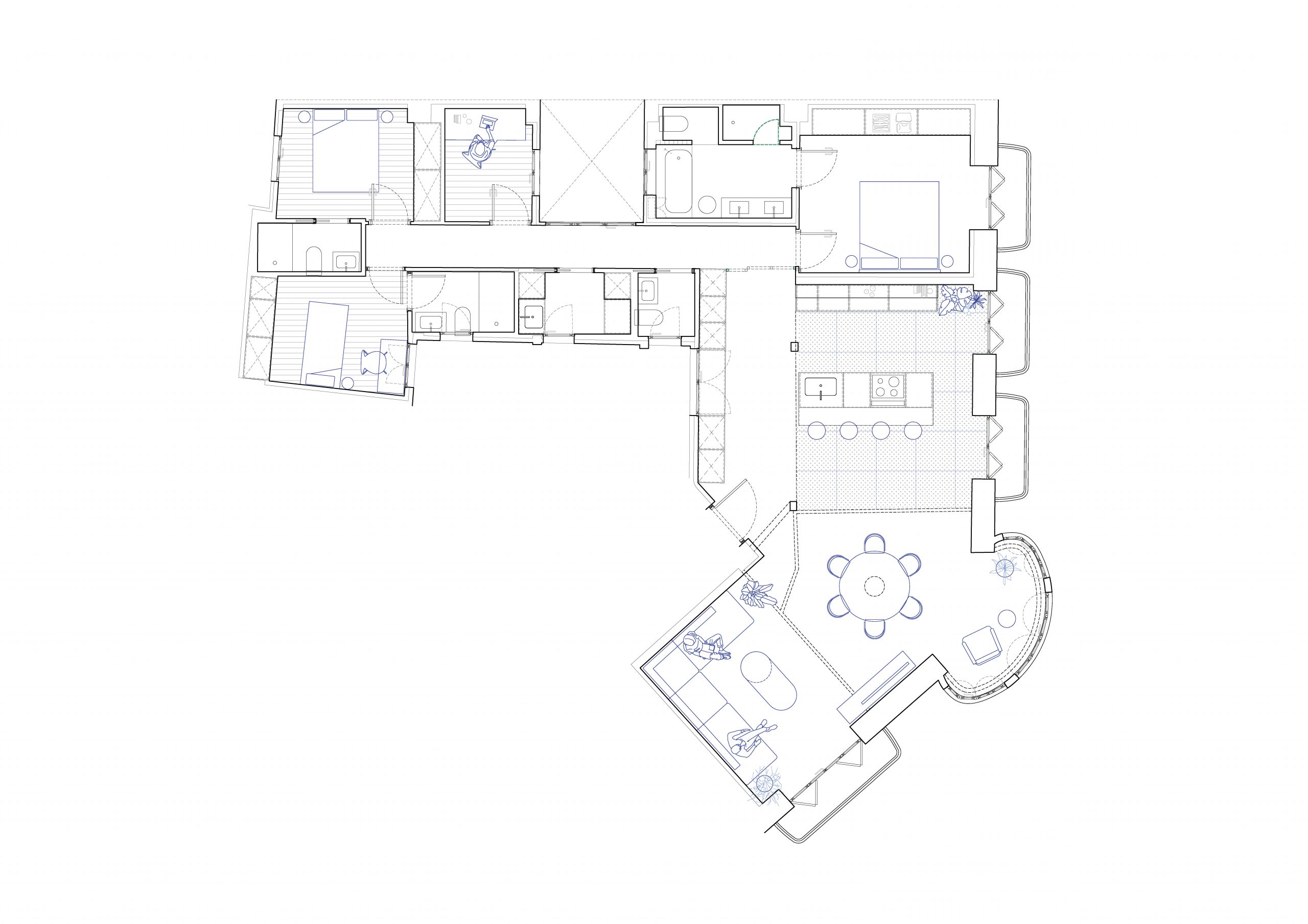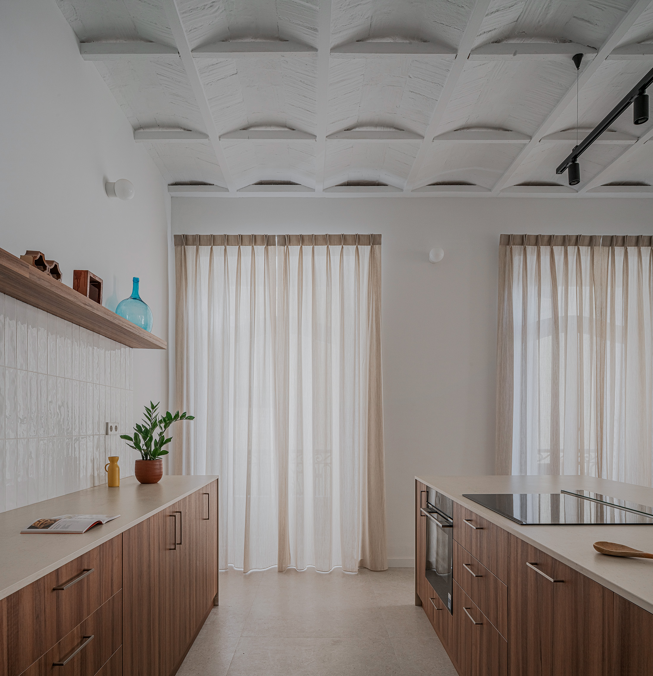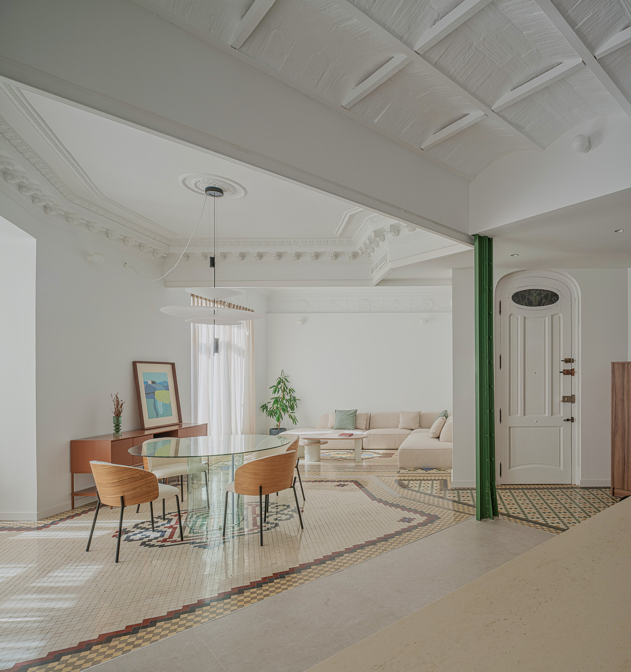 El nuevo esquema espacial responde a la necesidad de integrar las áreas sociales de la vivienda. La eliminación de tabiques permitió abrir la cocina al salón-comedor, generando un único ámbito continuo que aprovecha al máximo la luz natural procedente de la fachada principal. El mirador curvo, pieza singular del edificio, se incorpora al espacio central como elemento protagonista, reforzando la relación visual con el exterior. La intervención revela y pone en valor la estructura original, integrando los pilares metálicos y el forjado descubierto como parte del lenguaje arquitectónico del proyecto.