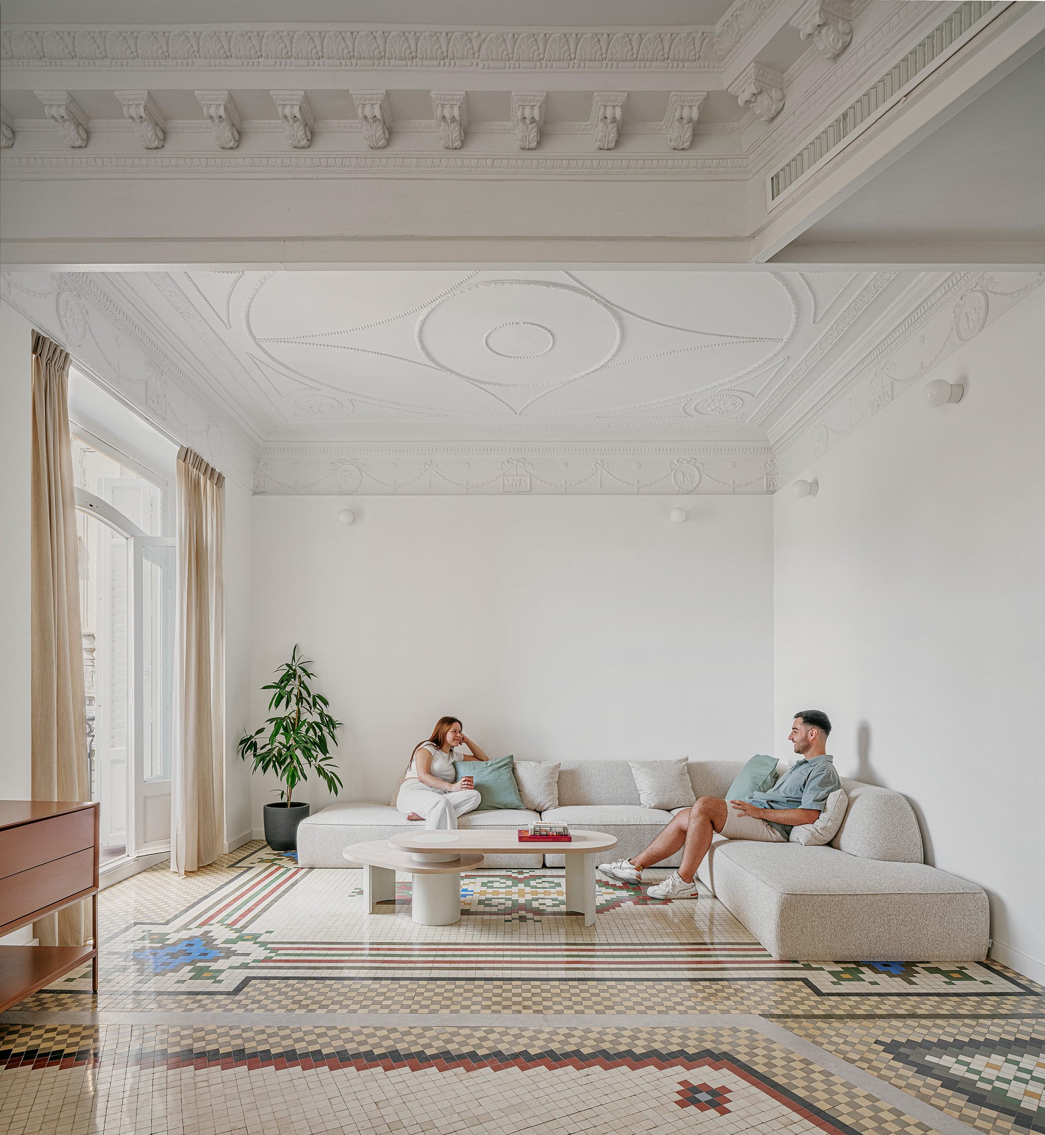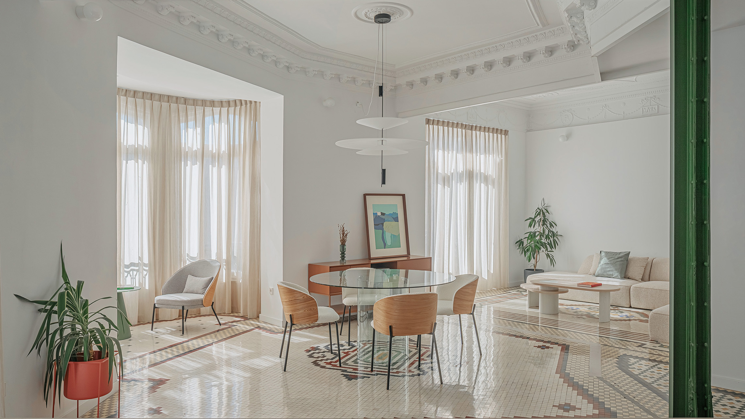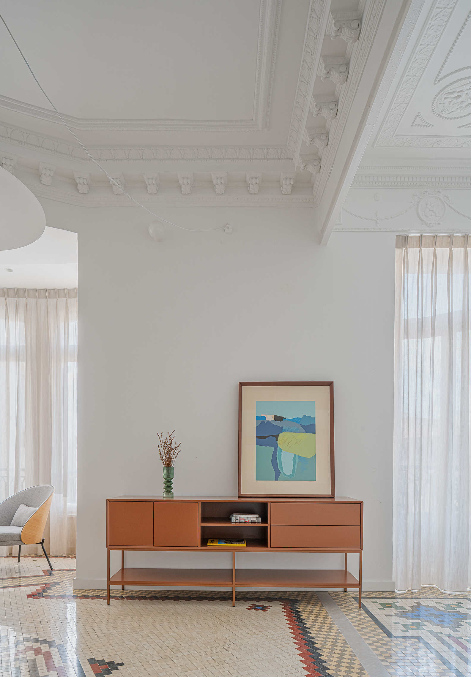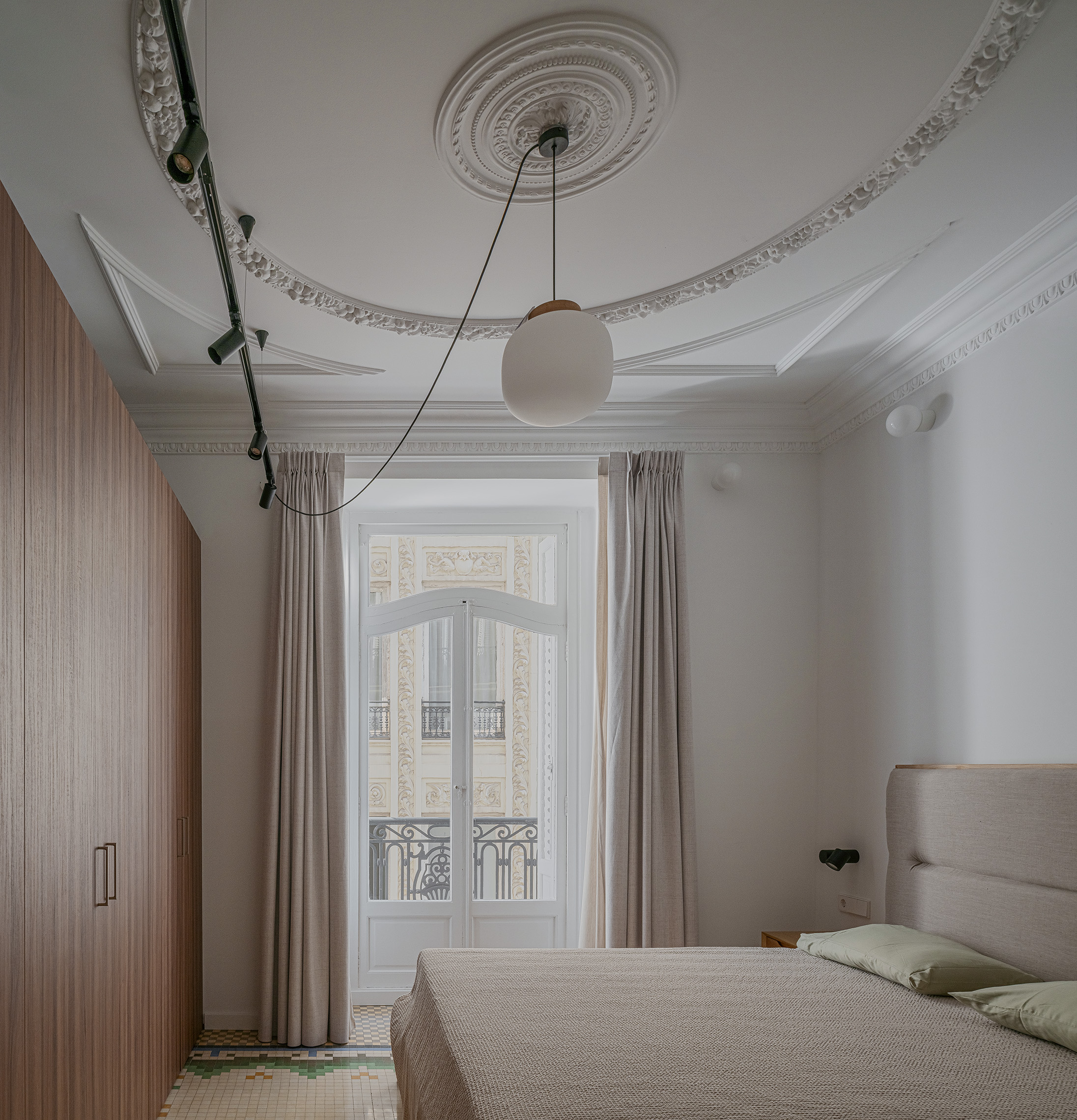 La gestión global de proyecto y obra permitió coordinar de forma eficiente todas las fases del proceso, desde el diseño inicial hasta el interiorismo final. Esta metodología integrada facilitó la toma de decisiones y la resolución ágil de los imprevistos propios de una rehabilitación en edificio histórico. La restauración de los elementos decorativos, junto con la actualización de las instalaciones y el mobiliario a medida, consolidan una vivienda que combina patrimonio y contemporaneidad bajo una misma mirada arquitectónica.